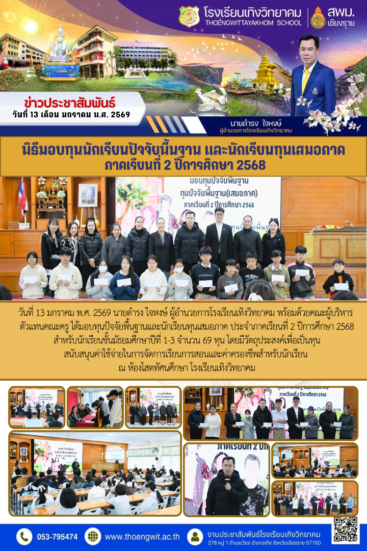 พิธีมอบทุนนักเรียนปัจจัยพื้นฐาน และนักเรียนทุนเสมอภาค ภาคเรียนที่ 2 ปีการศึกษา 2568 นางสาวจิราวรรณ เรือนสิทธิ์ 13 มกราคม 2569 กลุ่มบริหารงานกิจการนักเรียน เข้าชม : 37
