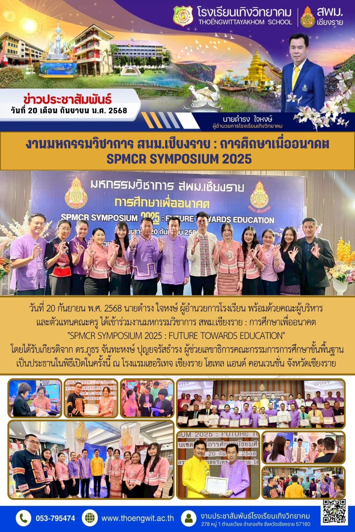 งานมหกรรมวิชาการ สพม.เชียงราย : การศึกษาเพื่ออนาคต SPMCR SYMPOSIUM 2025 นางสาวจิราวรรณ เรือนสิทธิ์ 22 กันยายน 2568 กลุ่มบริหารงานวิชาการ เข้าชม : 87