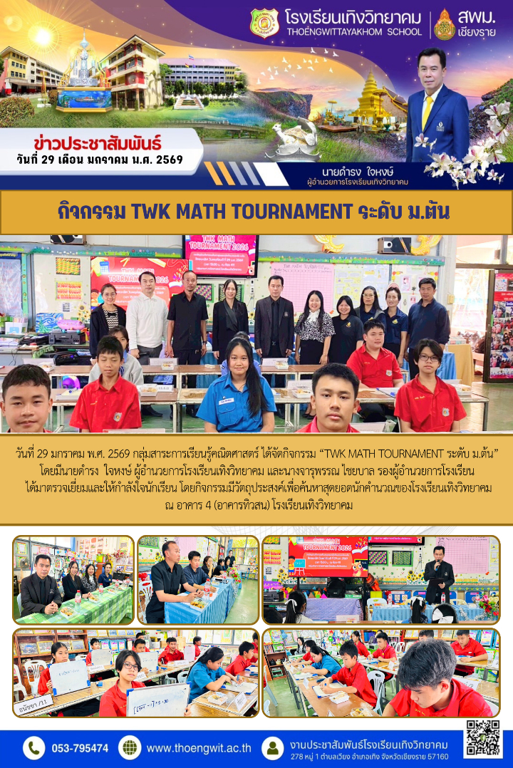 กิจกรรม TWK MATH TOURNAMENT ระดับ ม.ต้น นางสาวจิราวรรณ เรือนสิทธิ์ 29 มกราคม 2569 กลุ่มบริหารงานวิชาการ เข้าชม : 70