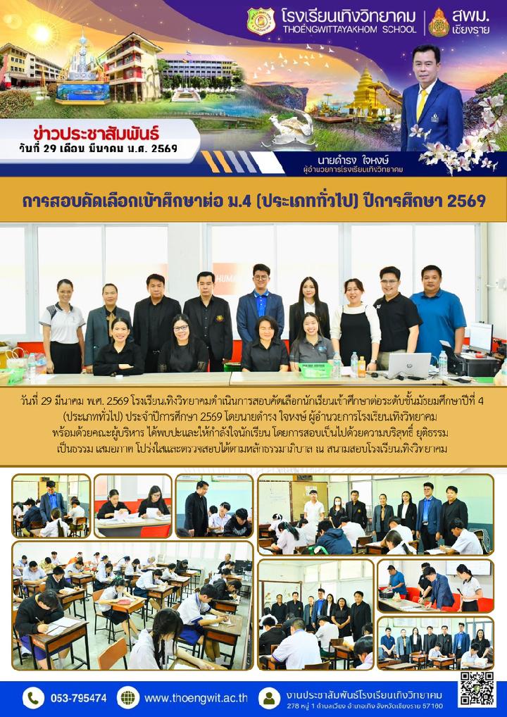 ประกาศรายชื่อนักเรียนผู้มีสิทธิ์สอบเข้าศึกษาต่อระดับชั้นมัธยมศึกษาปีที่ 4 (ประเภททั่วไป) ปีการศึกษา 2569