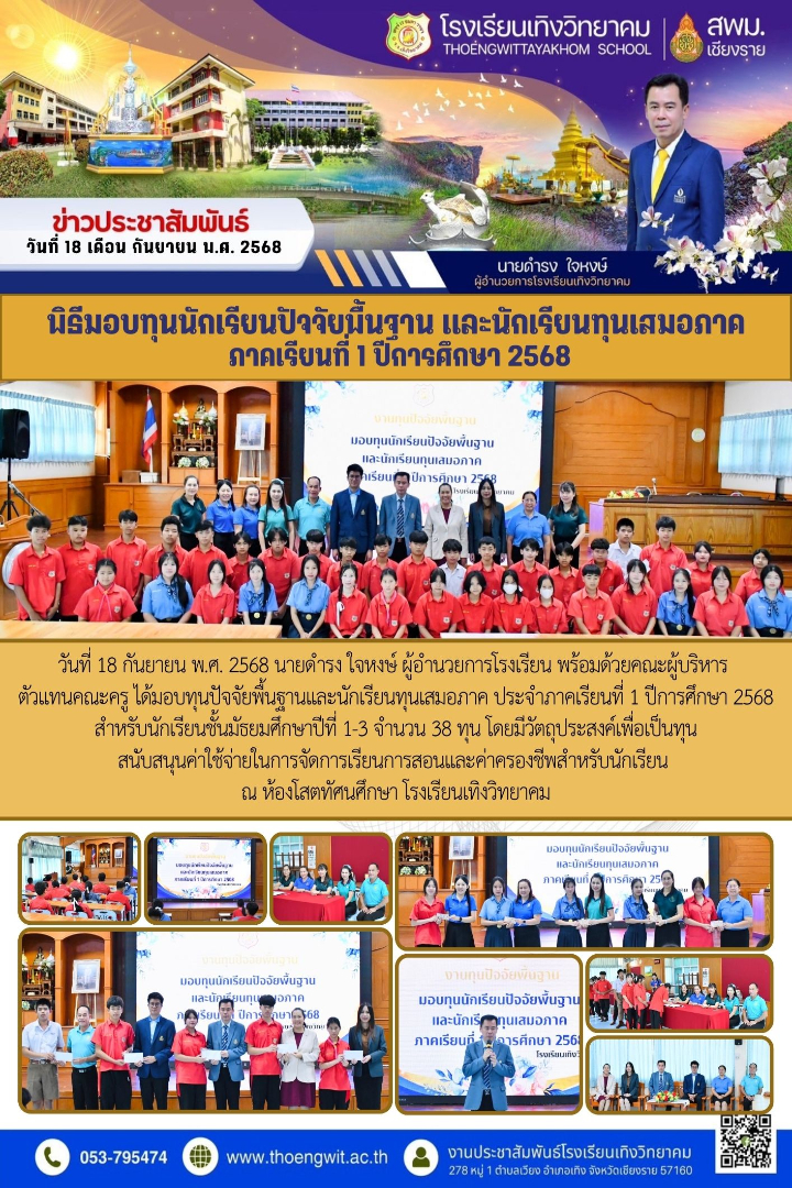 พิธีมอบทุนนักเรียนปัจจัยพื้นฐาน และนักเรียนทุนเสมอภาค ภาคเรียนที่ 1 ปีการศึกษา 2568 นางสาวจิราวรรณ เรือนสิทธิ์ 19 กันยายน 2568 กลุ่มบริหารงานวิชาการ เข้าชม : 75