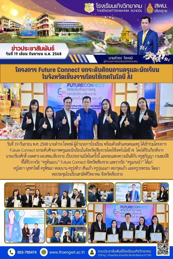 โครงการ Future Connect ยกระดับศักยภาพครูและนักเรียน ในจังหวัดเชียงรายโดยใช้เทคโนโลยี AI นางสาวจิราวรรณ เรือนสิทธิ์ 19 กันยายน 2568 กลุ่มบริหารงานวิชาการ เข้าชม : 89